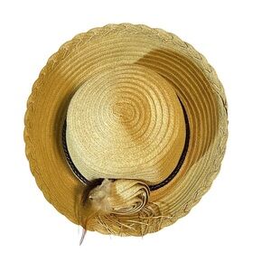 ・ Vintage-style 1920's tan straw hat has a brown braided band with a rosette & feather accents.