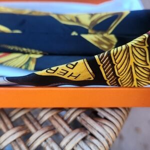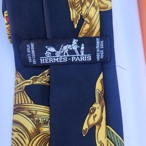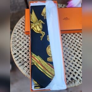The Hermes silk tie, featuring a mythological motif in gold, red, gray and green on a black field. Measures approximately 56.0 inches (142.2 cm) in length. Tag: "Hermes-Paris, 100% Silk, Made in France." Accompanied by original Hermes box.