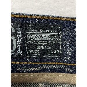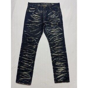 The Hertage By America Men's W38 L34 Patched Distressed Skinny Jeans Acid Wash With Dusty Black Whisker Accents.