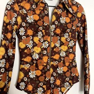 Step into vintage vibes with this bold retro-inspired bodysuit. Featuring a rich chocolate-brown base splashed with vibrant orange, golden yellow, and white daisy florals, this piece is a true throwback to the 70s. The collared neckline and front zip closure add a playful, statement touch, while the long sleeves and fitted silhouette make it both flattering and versatile. Perfect for styling with high-waisted denim, skirts, or layered under overalls for that effortless festival or boho-chic look.