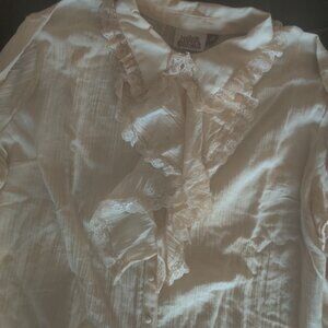 Make your day dreamy with the enchanting Storyteller Cream Lace Trim Ruffle Blouse—a romantic favourite with endless styling possibilities. Crafted from soft cotton, this cream floral blouse is delicately detailed with floral lace and fluttering ruffles. Whether worn on its own or layered under vests and waistcoats, it’s the ultimate layering piece for free spirits and vintage lovers alike.