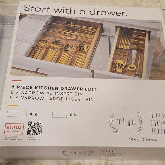 Brand New The Home Edit 6 Piece Kitchen Drawer Set. This set contains 2 Narrow Xtra Large insert bins & 4 Narrow Large Bins. These are good for organizing kitchen utensils drawers, as shown and bathroom, bedroom and garage and plenty more spaces in your home that might need organizing.