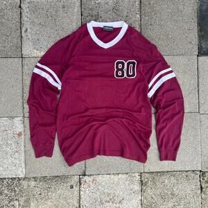 red long sleeve, streetwear, vintage, logo detail, relaxed fit, bold color, casual wear, layered look, athletic style, street fashion