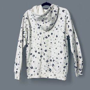 White Full Zip Safety Pin Hoodie. Excellent Like New Condition. Size Small Measurements: PTP 22”, Length 25”, Sleeve 25”. 24O