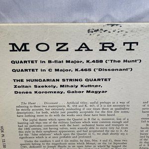 The Hungarian String Quartet, Mozart Mozart Quartets (Vinyl, 1962) VOX PL 12.130 VG. Used with some wear and blemishes see pictures sold as is. Cover has binding tape, scuffs, stains and ring wear. Record has light scratches, a sticker and pen marks on label.