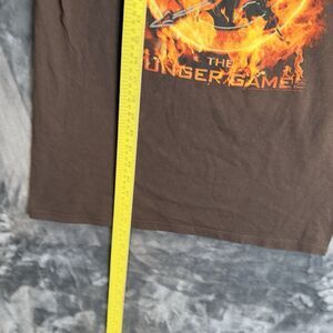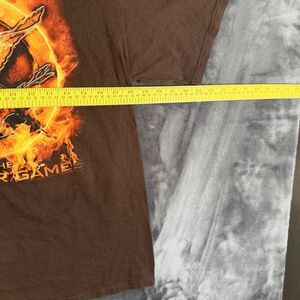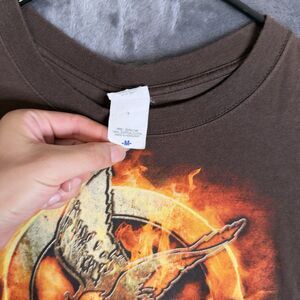 The Hunger Games Movie Promo Short Sleeve T-Shirt in size Medium features a flame design with a bird and arrow motif, perfect for fans of the popular franchise. This brown shirt is designed for men with a regular fit and short sleeves, making it a stylish and comfortable addition to any wardrobe. Show off your love for The Hunger Games with this eye-catching t-shirt that captures the essence of the dystopian world created by author Suzanne Collins.
