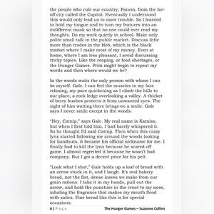 In the ruins of a place once known as North America, lies the nation of Panem, a shining Capitol surrounded by twelve outlying districts. The Capitol is harsh and cruel and keeps the districts in line by forcing them all to send one boy and one girl between the ages of twelve and eighteen to participate in the annual Hunger Games, a fight to the death on live TV.
