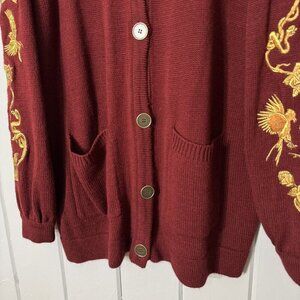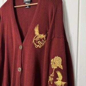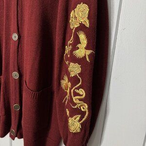 The Hunger Games Ballad of Songbirds and Snakes embroidered cardigan sweater. Front pockets, button front. Gold thread embroidered birds and snakes design down both sleeves and on the front. Rich red color.
