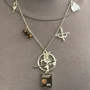 This unisex necklace features at its center a silver Mockingjay pendant, just like the Mockingjay pin Katniss wears in the Games, with a book cover pendant dangling from it. To its left are violet berry charms, for the poisonous nightlock berries Katniss and Peeta almost eat in an act of defiance against the Capitol. Further left is a champagne glass charm, for the clear liquid people drink at the Capitol parties, so they can vomit and continue eating, representing their hedonistic excesses. To the right are a bow and arrow charm, for Katniss's weapon of choice, and a fire charm, for the destructive symbol of fire throughout the trilogy. This necklace has been newly handmade, and is adjustable from 18.5 to 27 inches (can be made shorter or longer upon request).