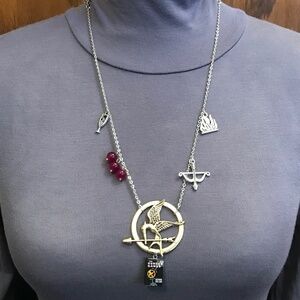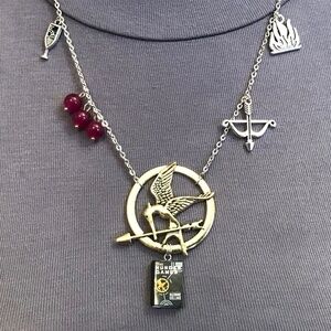 This unisex necklace features at its center a golden Mockingjay pendant, just like the Mockingjay pin Katniss wears in the Games, with a book cover pendant dangling from it. To its left are black-violet berry charms, for the poisonous nightlock berries Katniss and Peeta almost eat in an act of defiance against the Capitol. Further left is a champagne glass charm, for the pink liquid people drink at the Capitol parties, so they can vomit and continue eating, representing their hedonistic excesses. To the right are a bow and arrow charm, for Katniss's weapon of choice, and a fire charm, for the destructive symbol of fire throughout the trilogy. This necklace has been newly handmade, and is adjustable from 17.75 to 27.25 inches (can be made shorter or longer upon request).