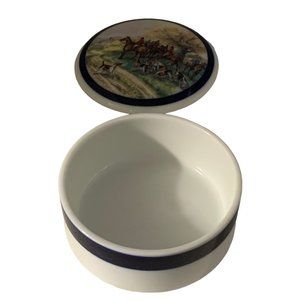 This exquisite lot of 4 trinket boxes feature a stunning hunting scene on its lid, perfect for any horse riding enthusiast. Its small size of 3 inches in length and 1.75 inches in height makes it an ideal storage option for all occasions. The round shape and multicolor design add a touch of modern style to this vintage piece.
