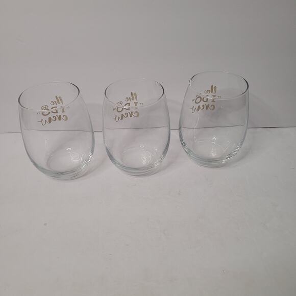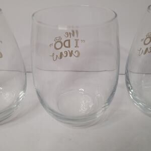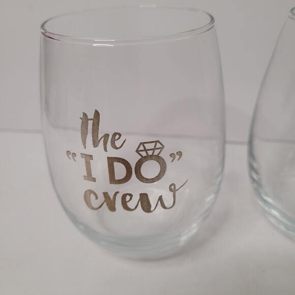 These are three clear, stemless wine glasses, each featuring the phrase "the 'I DO' crew" printed in a metallic gold font. These glasses are typically used for beverages like wine or cocktails and are commonly associated with pre-wedding celebrations, such as bridal showers, bachelorette parties, or as gifts for a wedding party.