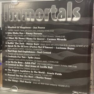 "The Immortals" is an album featuring various artists that was released on CD in 2001. With a total run time of 37 minutes, this jazz album is presented in a multicolor jewel case and includes English language tracks. Produced by Direct Source record label, this audio CD offers a collection of music from different artists in the jazz genre, making it a diverse and entertaining addition to any music collection #205673943807