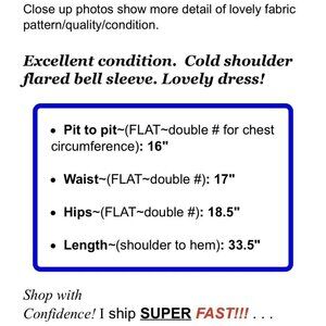 Excellent condition. Cold shoulder flared bell sleeve. Lovely dress!