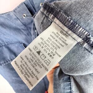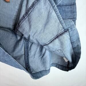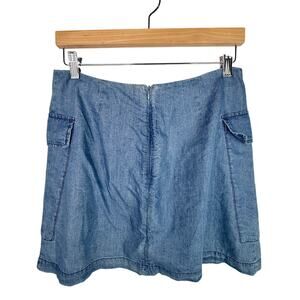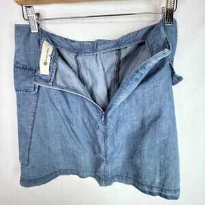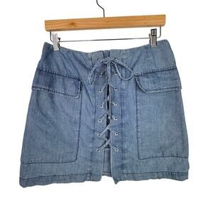 The Impeccable Pig denim/chambray lightweight lace up front mini skirt. Size medium. One small stitching imperfection at the bottom of back zipper (see photo)