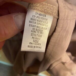 The Impeccable Pig Shirt is a stylish women's small oversized tan blouse with ruffle sleeves, perfect for various occasions like travel, parties, or casual wear. Made from a blend of polyester and rayon, this lightweight blouse features a collared neck with a button closure and a relaxed fit. The flutter sleeves and cinch waist accents add a touch of flair to this basic yet chic top, suitable for summer, fall, and spring seasons. Ideal for those who appreciate quality and style in their wardrobe choices.