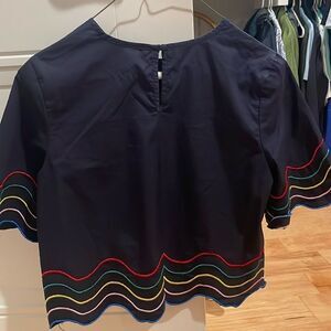 Beautiful navy top with colorful accents embr on the sleeves and bottom. It has a key hole button at the back neck. Perfect with white jeans!