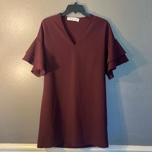The Impeccable Pig Maroon Flare Ruffle Sleeve Shift Dress Size Small