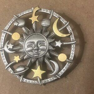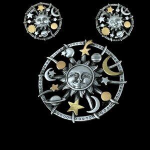 The JJ Jonette Celestial Brooch Pin, accompanied by matching earrings, is a distinctive vintage jewelry set that brings an elegant flair to any ensemble. The brooch showcases an exquisite design featuring the sun, moon, stars, comets, and planets, all crafted from pewter with silver and gold tones. Its simple yet celestial aesthetic is ideal for those who cherish a classic style. The brand JJ trade mark categorizes this brooch as a moon-shaped piece, with a Moon main symbol and a color scheme of silver and gold tones. Constructed from premium-quality pewter, the brooch is both sturdy and enduring. It is an excellent choice for enthusiasts of vintage and antique jewelry, promising to be a valuable addition to any collection. The JJ Jonette company, established in the 1930s, has made this item a coveted collectible, as nearly all pieces have been sold. The brooch measures 1.925 inches in height, and the earrings are 1 inch in width, offered as New Old Stock without tags.