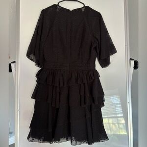 This black chic sundress by The Jetset Diaries is perfect for cocktail occasions, featuring a ruffled, tiered design that adds movement and flair. The dress boasts a stylish plunge neckline creating a sophisticated yet playful look. Its flowing silhouette and classic color make it a versatile choice for any event.