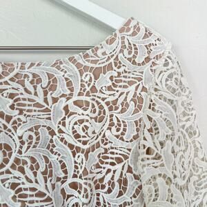 nude lining | white lace overlay | caged cutout back | long sleeves | side zipper closure | 100% polyester