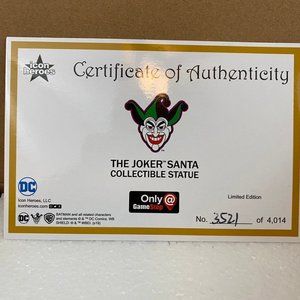 Icon Heroes DC Comics The Joker Santa Collectible Statue Only at Gamestop. GameStop exclusive figure based on Batman The Animated Series. Limited edition. Includes certificate of authenticity. Box has been opened and shows tears, blemishes and wear.