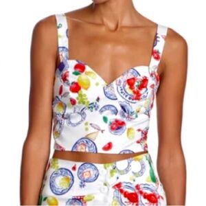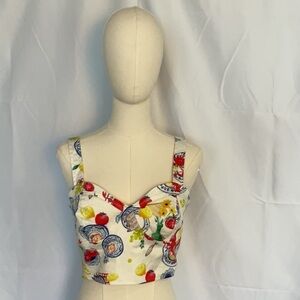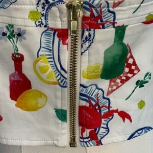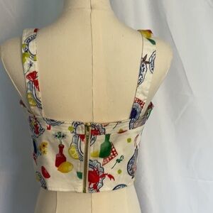 Such a fantastic top for summer! The Kat top- Festive Feast by Corey Lynn Calter offers a bustier style top in a print on stretch cotton so fun and "festive" with lemons, lobster, wine. White background with vibrant red, yellow, blue, green etc. Metal back full zip.