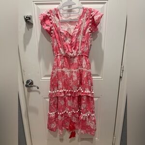 The Cece Dress a custom dress made by The Kemble Shop. It features our signature tunic prints in a fun, full dress- Pom Pom, eyelet cutouts and all!