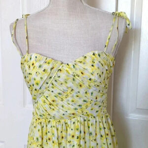 Twin straps that tie at the shoulders cap off the sunny charm of a breezy chiffon dress with flattering ruching throughout the sweetheart bodice and hints of metallic stripes that highlight the delicate anemone print. Exposed back-zip closure with tie shoulder straps. Sweetheart neckline. Lined. 100% polyester