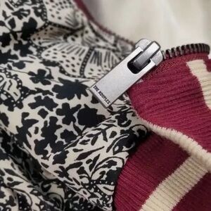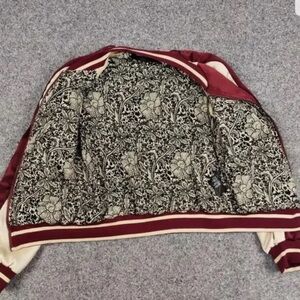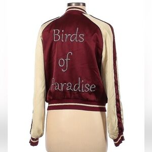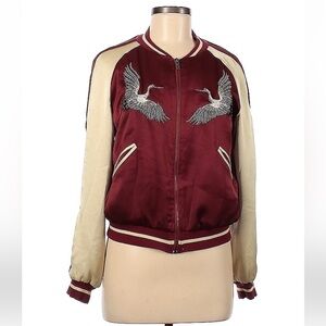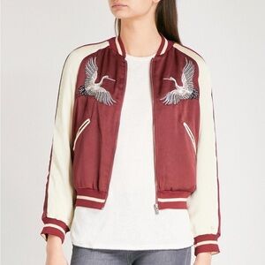 Awesome silk Bomber jacket from the Kooples. Rich burgundy color with large birds on front and “birds of paradise” on back. In like new condition