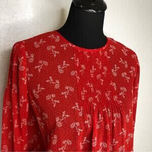The Kooples Bloom red sheer floral dandelion peplum top. Pullover style with round neckline. Pin tuck pleating at neckline and shoulders. Elastic waist with peplum hemline. Elastic ruffle sleeve cuffs. Zips in back. Size 2 or US Small. Excellent preowned condition.