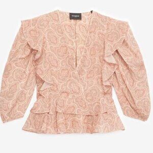 The Kooples Boho Silk Blend Crop Top Womens Pink Short Puff Sleeve V Neck Ruffle
