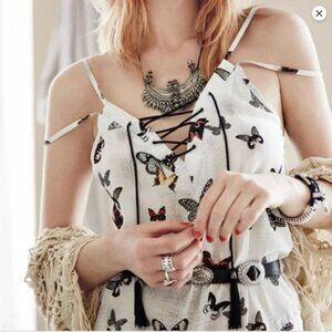 Charming tank dress cut from silk showcases a lace-up neckline, double-flounce hemline, a colorful butterfly print and a stamped-out crackled motif. 100% silk. Dry clean. By The Kooples.