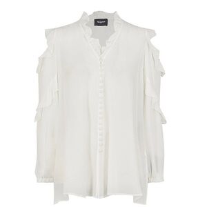 It's ethereal, romantic, and sexy! This The Kooples Cold-Shoulder Ruffled Silk-Georgette Blouse is an ultra-feminine blouse featuring ruffle accents, flirty shoulder cut-outs, and a V-neck with a dress button & loop front closure. It exudes comfort and elegance at any moment and can be mixed and matched with literally everything in your closet.