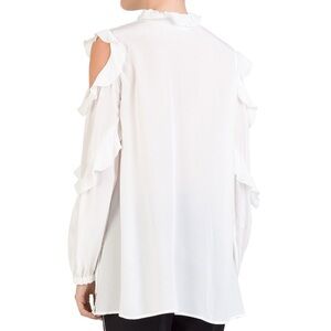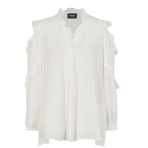 It's ethereal, romantic, and sexy! This The Kooples Cold-Shoulder Ruffled Silk-Georgette Blouse is an ultra-feminine blouse featuring ruffle accents, flirty shoulder cut-outs, and a V-neck with a dress button & loop front closure. It exudes comfort and elegance at any moment and can be mixed and matched with literally everything in your closet.
