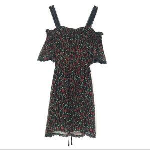 Black dress with red floral print. Crinkle fabric with lace trim. Cold shoulders with short sleeves. Elastic waist. Partially lined.