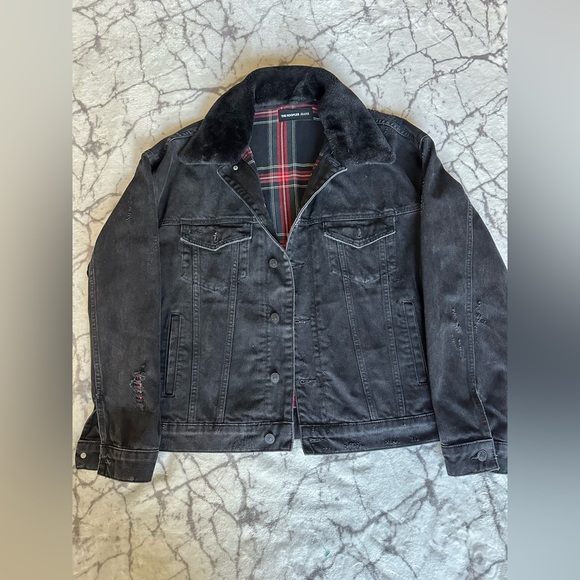 Charcoal denim jacket by The Kooples. Features a plaid lining and button closure. Ideal for a stylish, layered look.