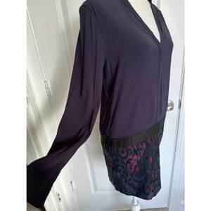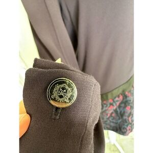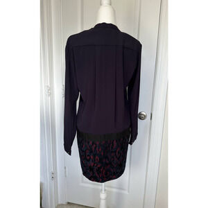 I love this The Kooples Drop Waist Dress in size 38, which is approximately equivalent to a medium. This is a stunning, deep navy dress (first photo and full length photo are best indication of color) with a black "belt" at the waist (attached) and black/red print at bottom. Gorgeous skull buttons at cuffs, which do have some minor scratches.