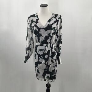 The Kooples short floral printed dress. Fluid material. Color names are ecru and black. Wrap style cut. Draped detail. Functional buttons up the front and on the cuffs. Puffed sleeves. Slightly padded shoulders. Lined. Polyester. Hand wash. New with tags.