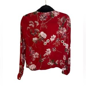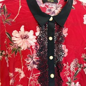 Pre owned like new. Stunning red floral button down blouse with black lace trim and faux pearl buttons. So pretty and can be dressed up or down. WOMENS size small.