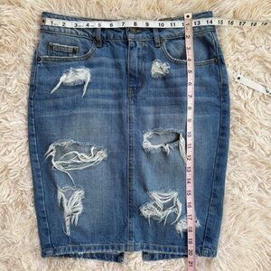 The Kooples Jeans denim distressed knee length skirt back slit SZ 25 blue pencil