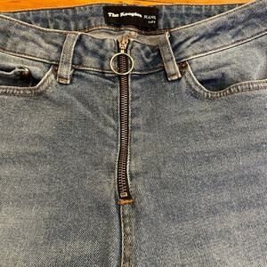 The Lizy Jean. Slim fit. Exposed zipper closure. Front and back pockets. Raw hem leg. Cotton blend.