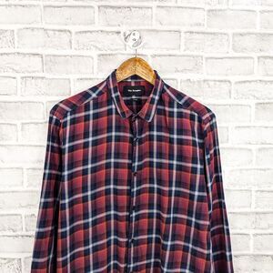 The Kooples Men's Fitted Button up Shirt in Red multi Plaid cotton size XL