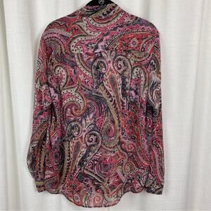 Vibrant paisley print. Long sleeves. Button-up front. Perfect for any occasion.