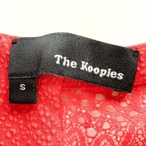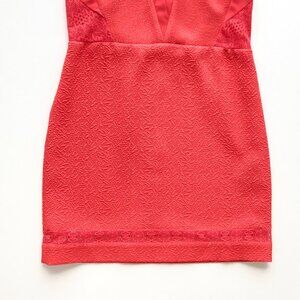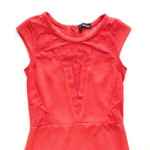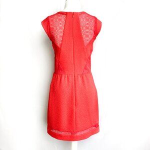 Warm red party dress from The Kooples has a textured main fabric with lace illusion insets, cap sleeves, lace inset strip near hem and back zip. Poly with some spandex. Tag advises no washing but I hand-washed it and hung it to dry without issues.