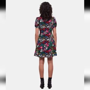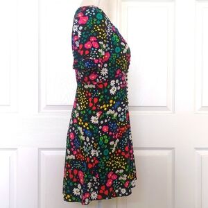 This vibrant floral dress features a stunning array of colors, perfect for any occasion. The V-neck design adds a touch of elegance, making it a must-have for your wardrobe. Multicolor floral print. Button down front. Short sleeves. Plunging V-neck. Fitted waist. Flared bottom