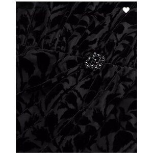 Crafted from vine-patterned burnout velvet fabric, this elegant The Kooples short dress in a classic black hue offers a sophisticated choice for various occasions. The dress features a flattering gathered bodice, a round neckline, and a convenient zip closure at the back. Adding a touch of glamour, the dress is accented with a jeweled ornament at the front waist, and it comes fully lined for comfort. Whether attending a cocktail party, a wedding, or a holy communion, this versatile piece in size S is suitable for multiple events and seasons. Machine wash or dry clean for easy care.