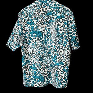 NWT Vibrant teal leopard print collared button down shirt with short sleeves. Extra buttons. French sizing. MSRP $225