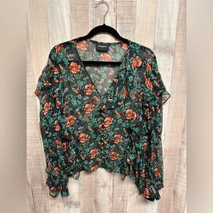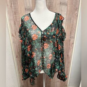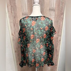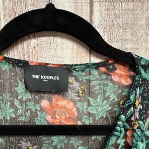 The kooples floral sheer 100% silk blouse. Beautiful print. Gold buttons. Ruffles. Size 2. Fits as a large. Like new condition