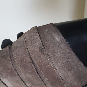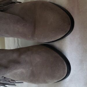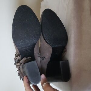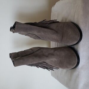 The Kooples fringe buckle genuine suede leather ankle booties, chunky heeled stacked heel, gray, women's 40.